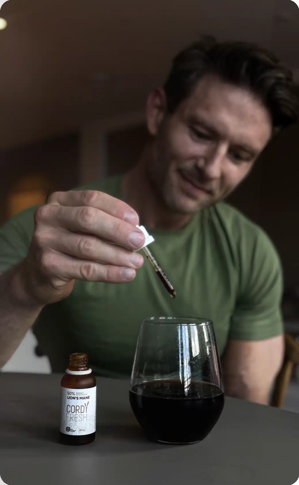 CordyFresh laver økologiske ekstrakter af Lion’s Mane, Reishi og Chaga – altid dobbelt-ekstraheret, altid fra 100% frugtlegemer og uden tilsætningsstoffer. Produceret lokalt i Aarhus og med naturligt bundfald, som viser, at ekstrakterne er potente.